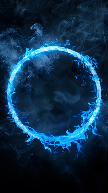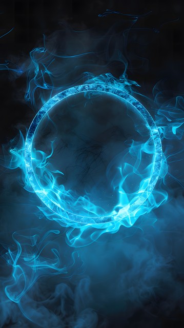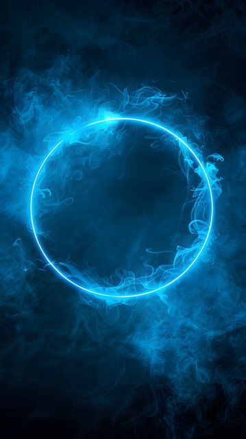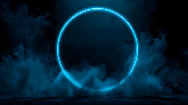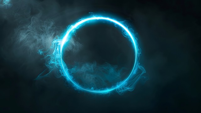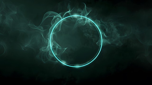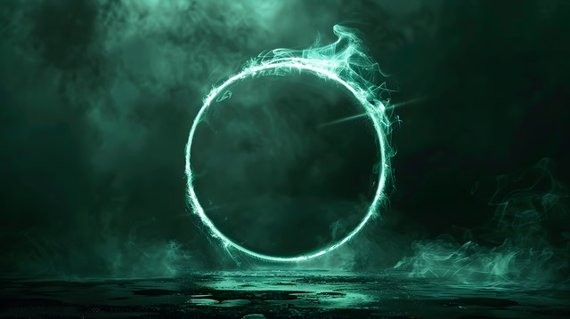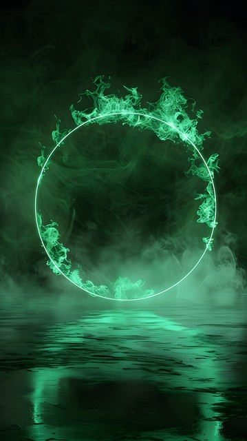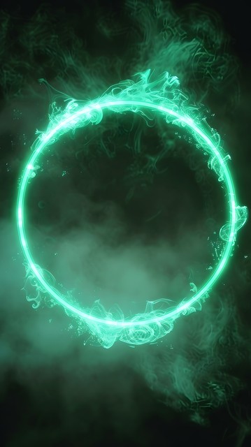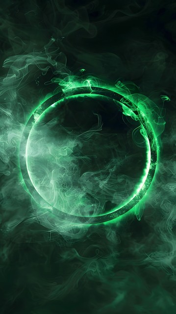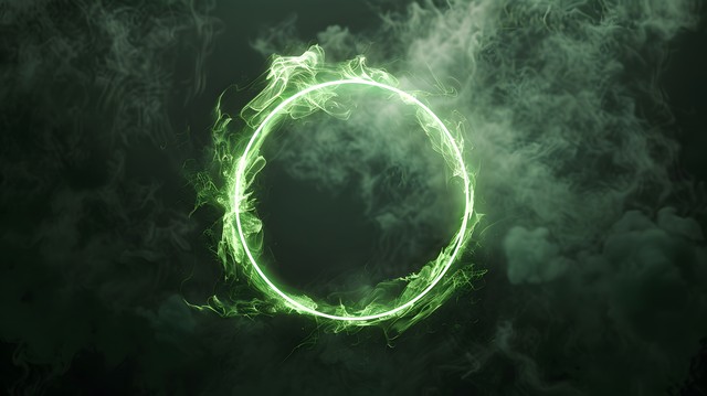 黑色背景上的绿色发光圆圈,带有光效和烟雾