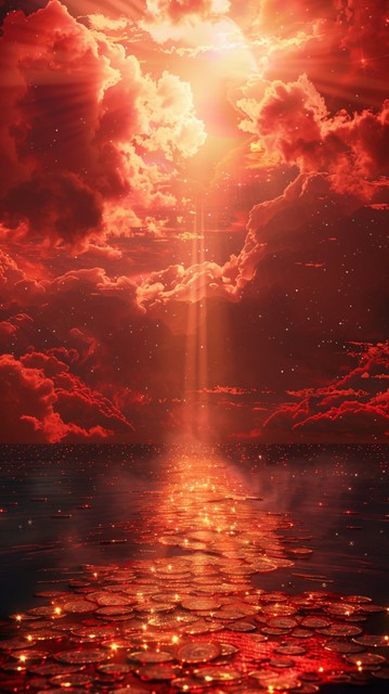 天空中的红河,两侧红色和白色云朵,背后光束,地面暗蓝色水反射上方色彩。