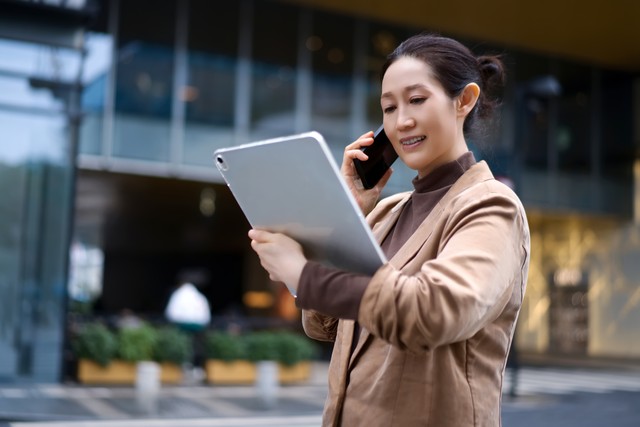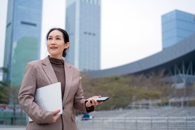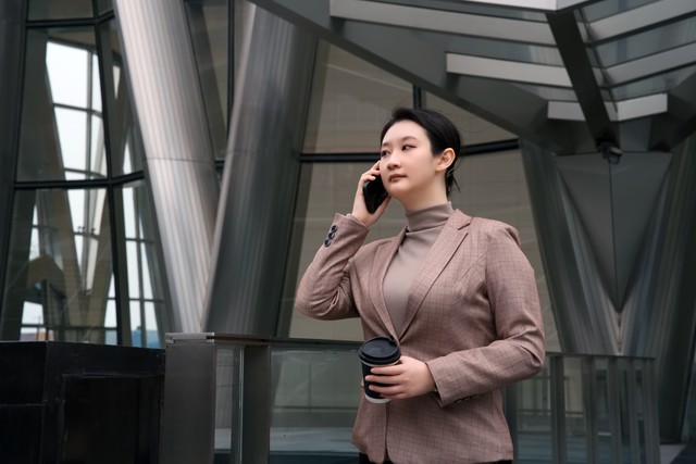 年轻的专业人士在旅途中使用智能手机和咖啡