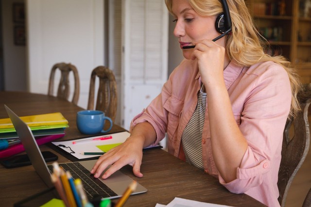 白人妇女在家工作,戴着耳机,使用笔记本电脑,在视频通话中说话