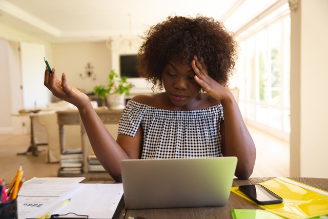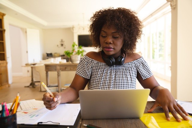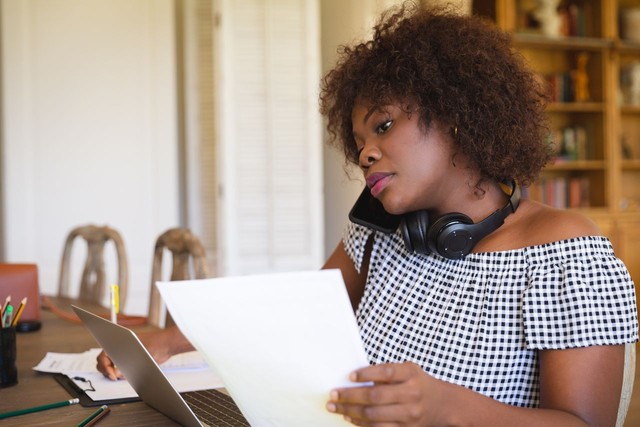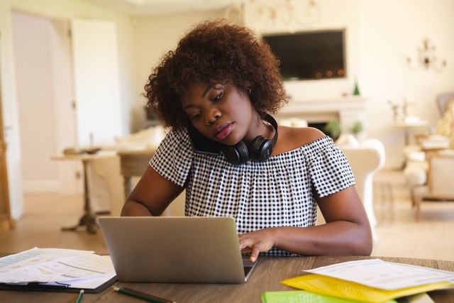 非裔美国妇女在客厅工作,使用笔记本电脑、文书工作和智能手机通话