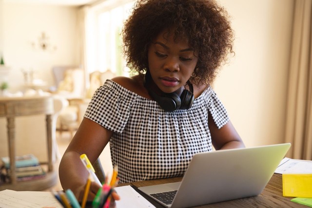 戴耳机的非裔美国妇女,在客厅里用笔记本电脑工作,做笔记