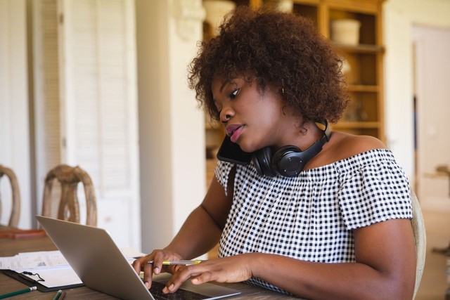 非裔美国妇女在客厅工作,使用笔记本电脑和智能手机交谈