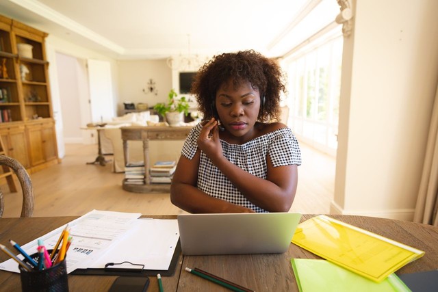 非洲裔美国妇女在客厅工作,使用耳机和笔记本电脑,在视频通话中交谈