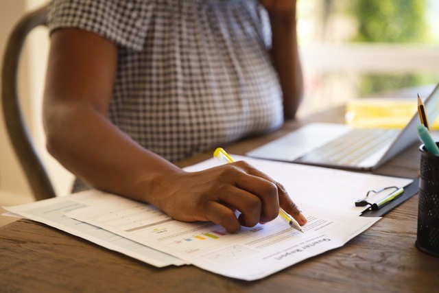 非裔美国妇女的腹部在客厅使用笔记本电脑工作并做笔记