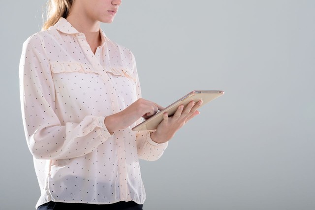 白人女商人使用数字平板电脑,孤立在灰色背景