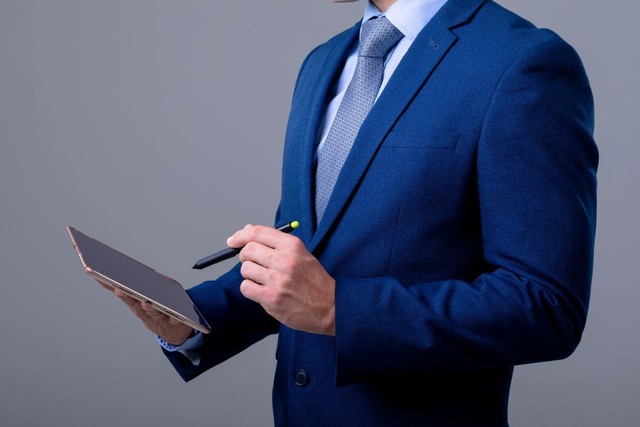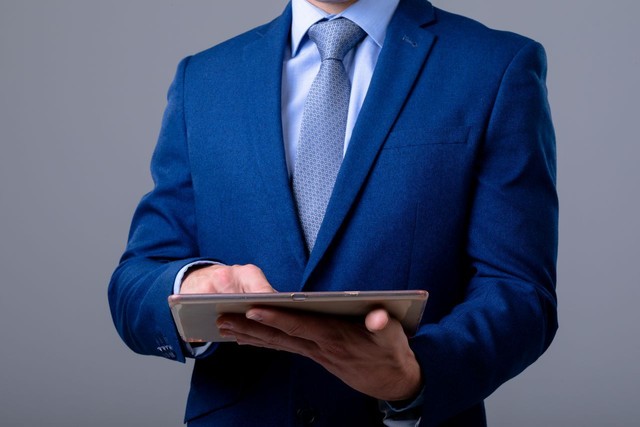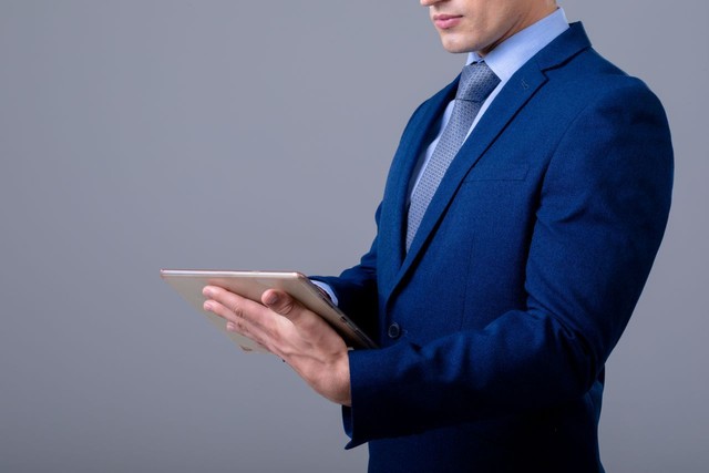 白人商人使用数字平板电脑,孤立在灰色背景