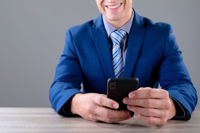 微笑的高加索商人使用智能手机,孤立在灰色背景