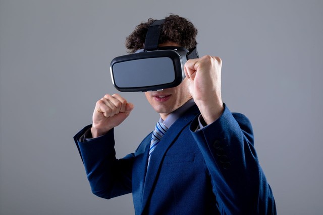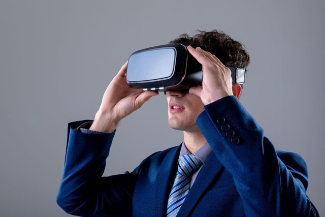 白人商人戴着虚拟现实耳机,孤立在灰色背景