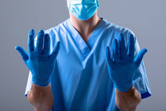 白人男医生戴着口罩和医用手套
