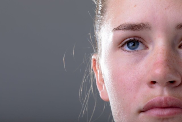 高加索女商人面部特写,孤立在灰色背景