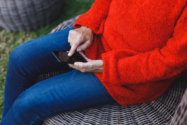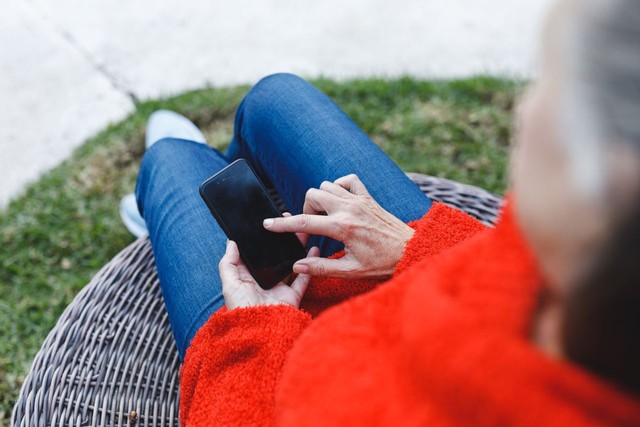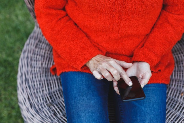 老年高加索妇女在花园里使用智能手机的腹部