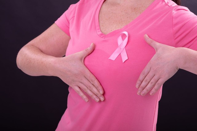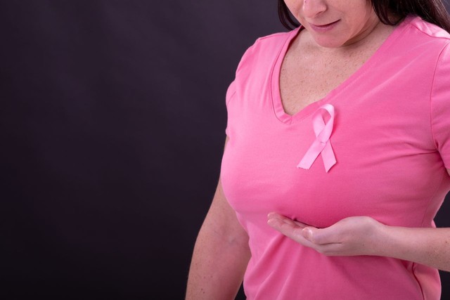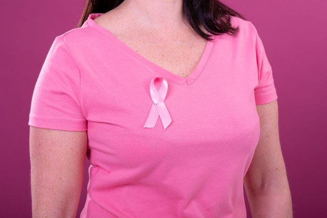 穿着粉色t恤的高加索女人的腹部,用粉色丝带打手势