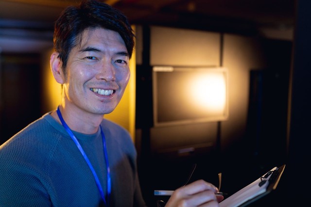 亚洲男工程师在电脑机房剪贴板上写字时微笑的肖像