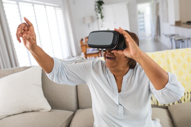 快乐的非裔美国高级女性在家戴着虚拟现实模拟器指指点点