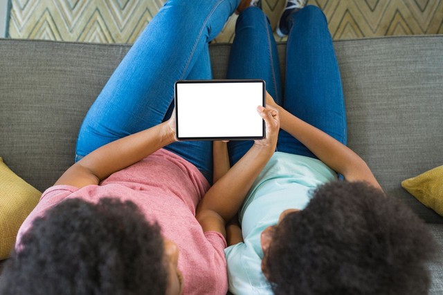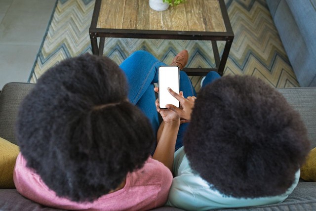 十几岁的女孩指着空白屏幕,教妈妈在家里使用智能手机,复制空间