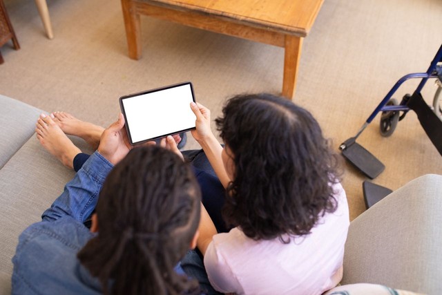 十几岁的女孩坐在家里的沙发上教母亲使用数字平板电脑,复印空间