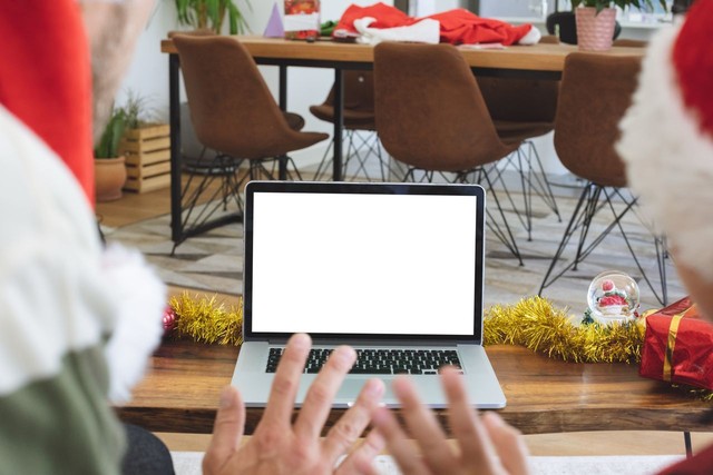 男人和儿子戴着圣诞帽在家里的笔记本电脑上视频聊天时挥舞着手
