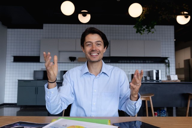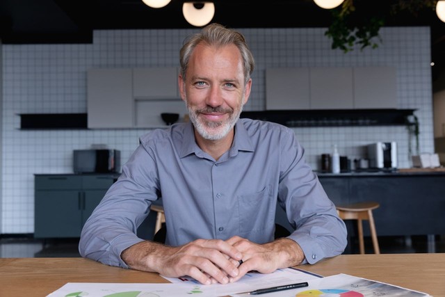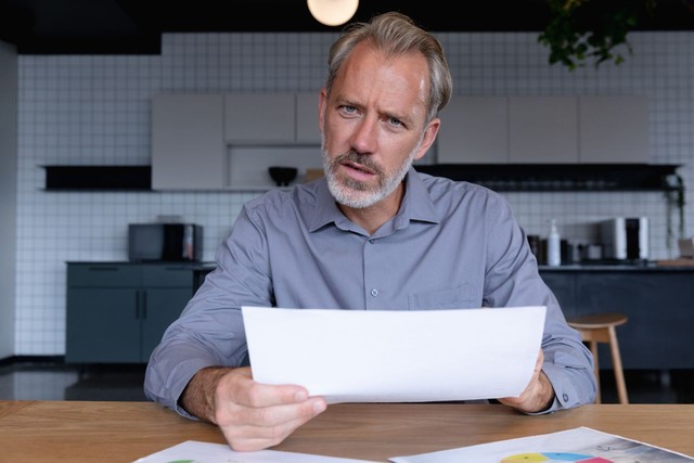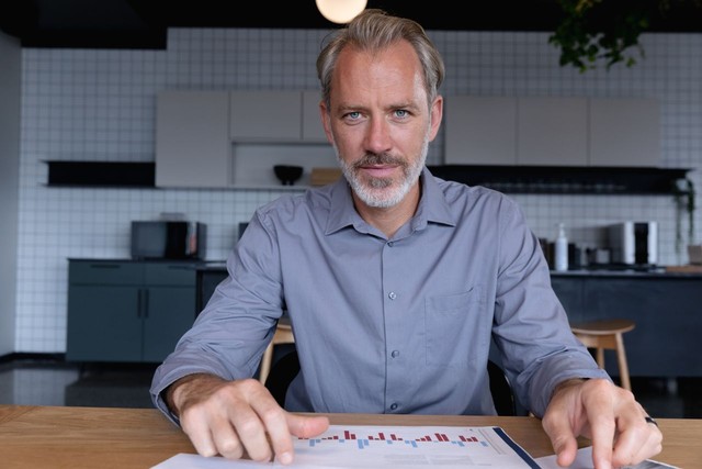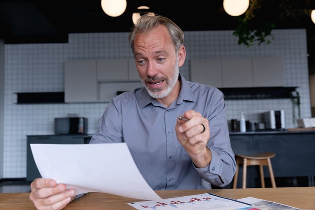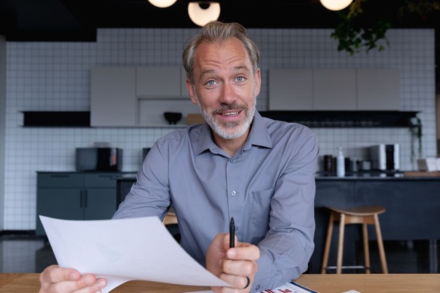 白人商人坐在现代办公室里通过文书工作进行视频聊天