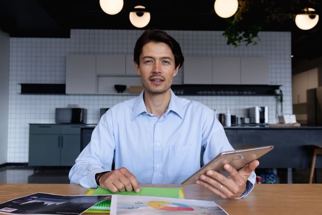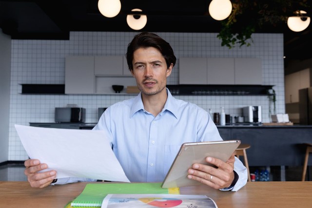 白人商人坐着视频聊天,在模式下使用数字平板电脑完成文书工作