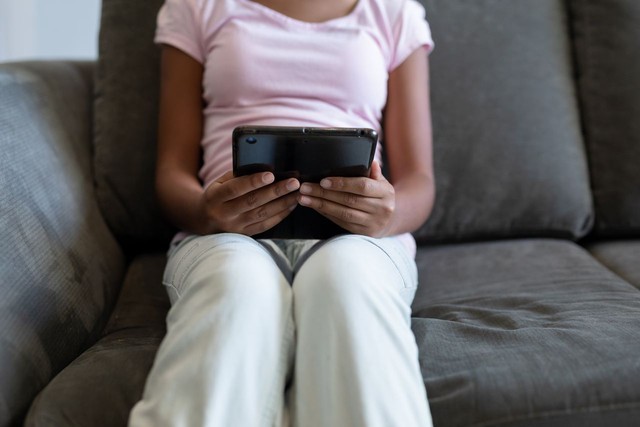 混血女孩的腹部坐在沙发上使用数字平板电脑