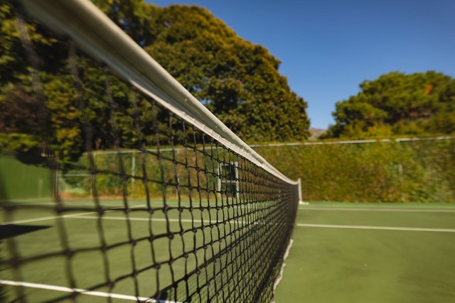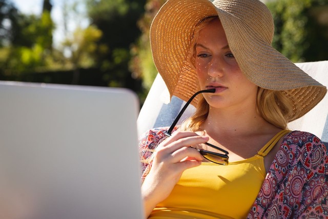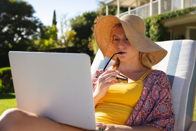 白人妇女坐在阳光明媚的花园里,戴着太阳帽,使用笔记本电脑,集中注意力