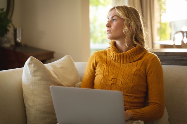 白人妇女坐在客厅的沙发上,用笔记本电脑,把目光移开