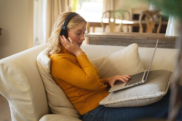 白人妇女在客厅的沙发上放松,戴着耳机,使用笔记本电脑