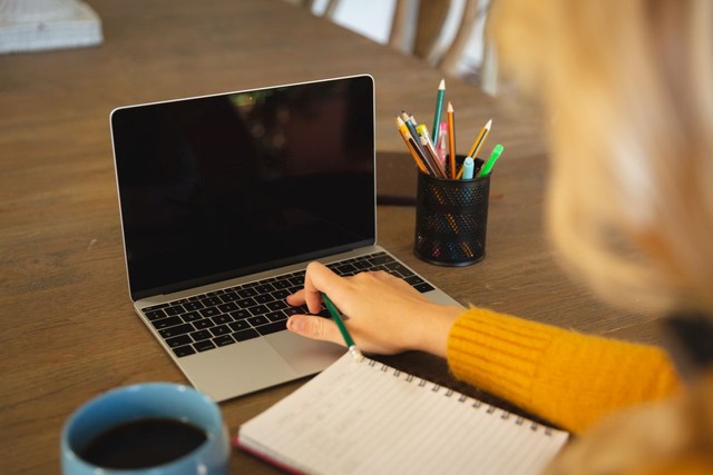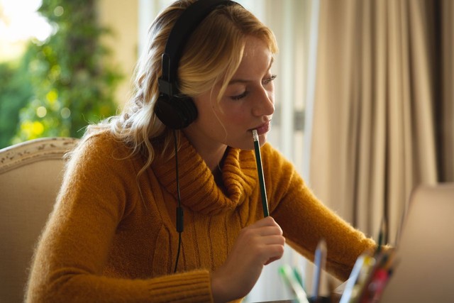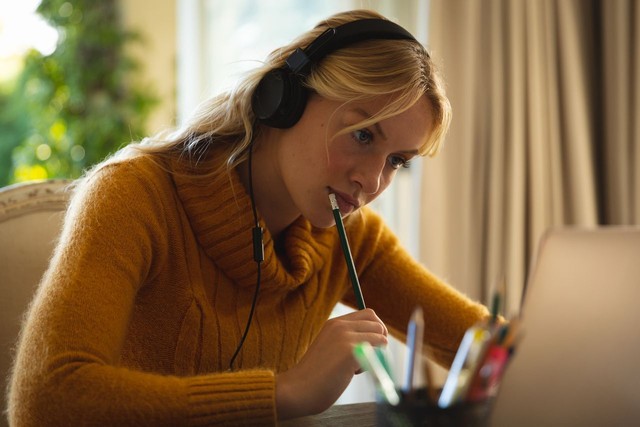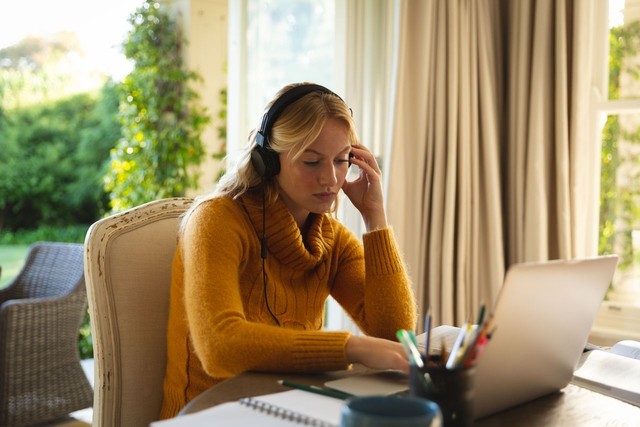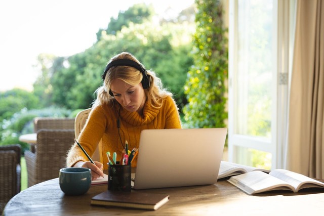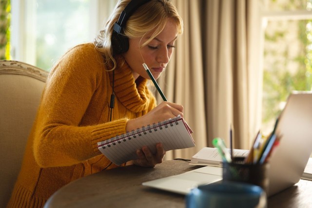 白人妇女在家客厅工作,戴着耳机,使用笔记本电脑,做笔记