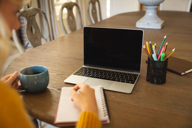 白人妇女在家客厅工作,在桌子上写作,使用笔记本电脑,在屏幕上复制空间