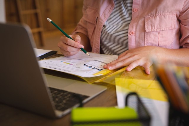高加索妇女的腹部坐在客厅的桌子旁工作,使用笔记本电脑并做笔记