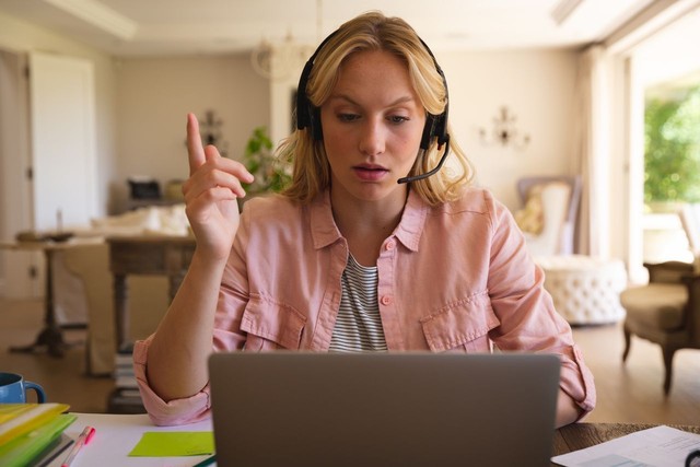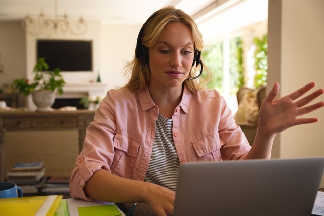 白人妇女在客厅工作,戴着耳机,使用笔记本电脑,在视频通话中说话