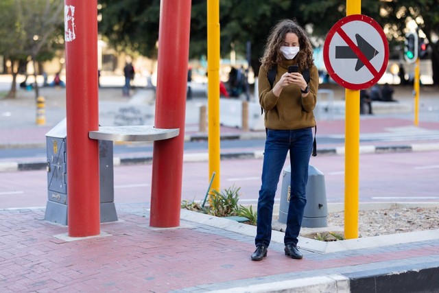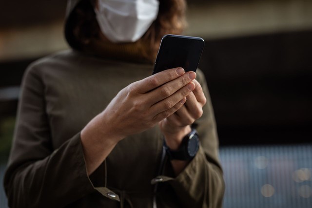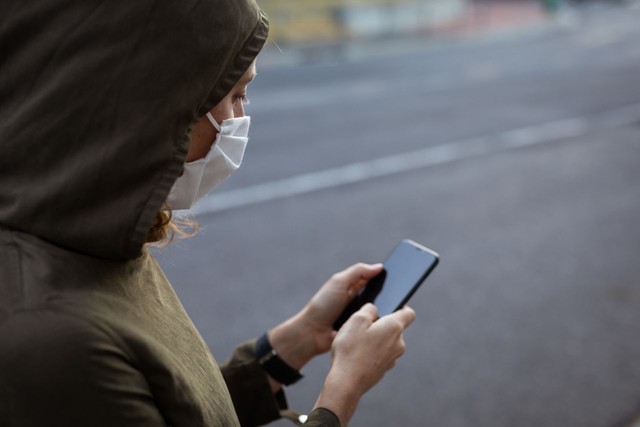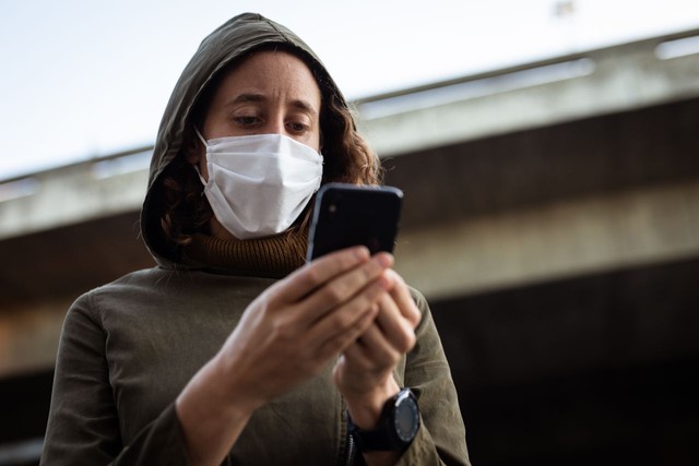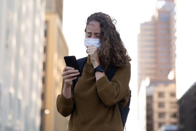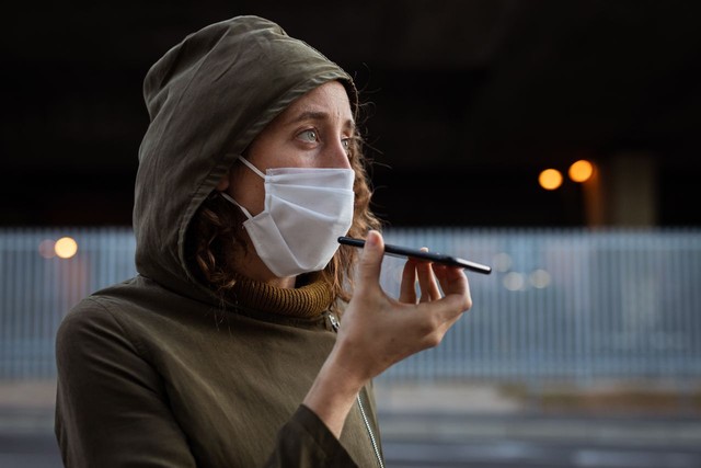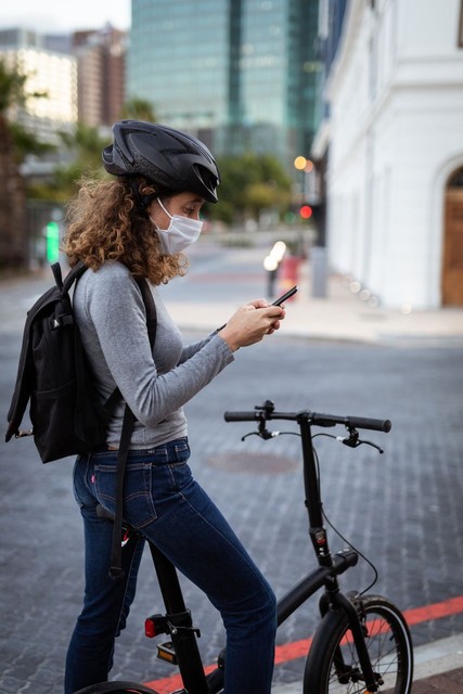 戴着防护面罩和自行车头盔的高加索妇女在街上使用手机