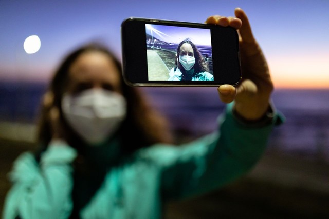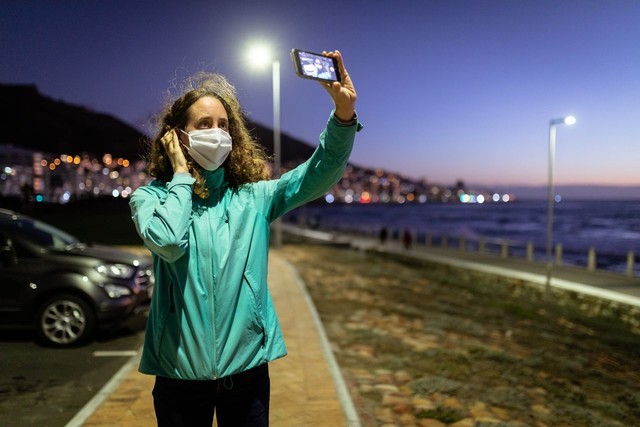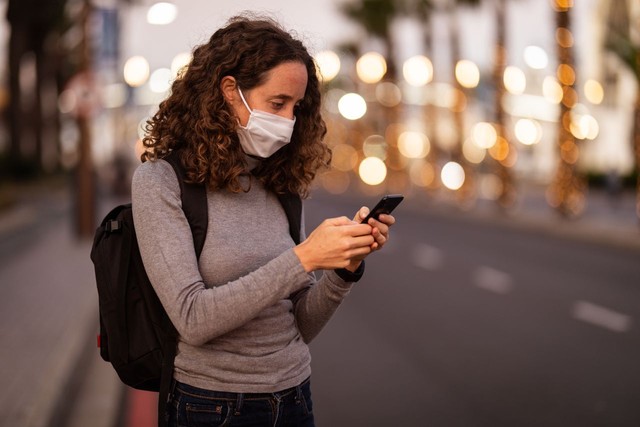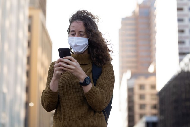 戴着冠状病毒防护口罩的高加索妇女在街上拍照