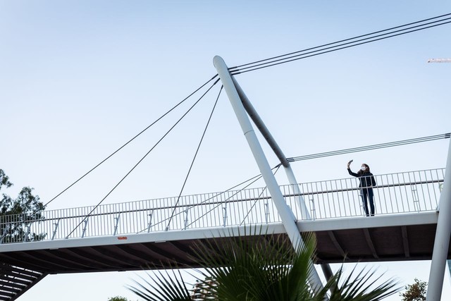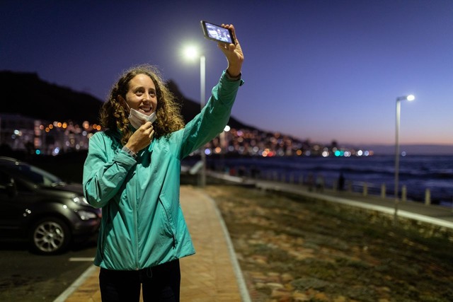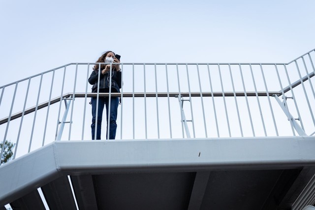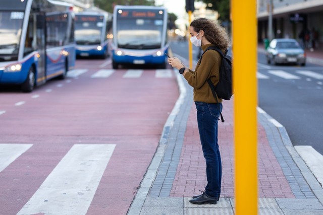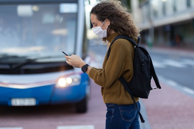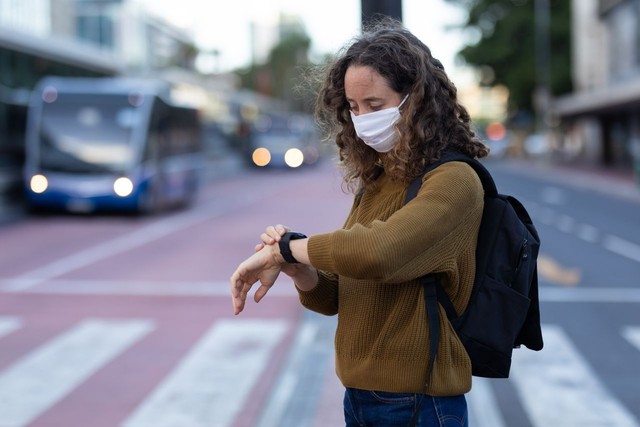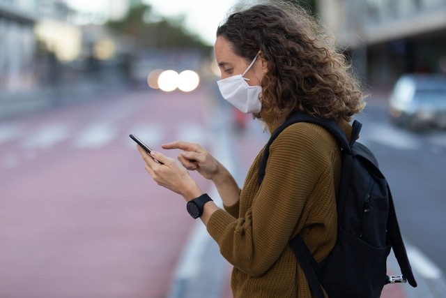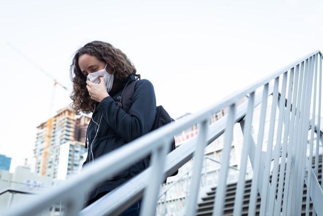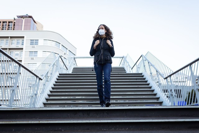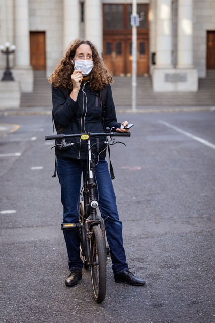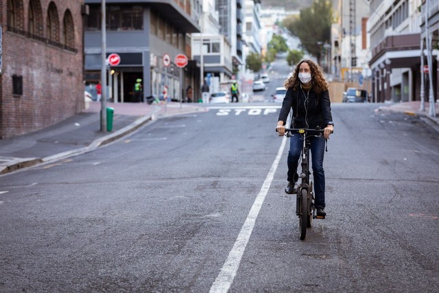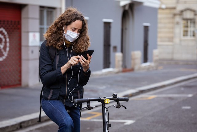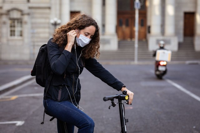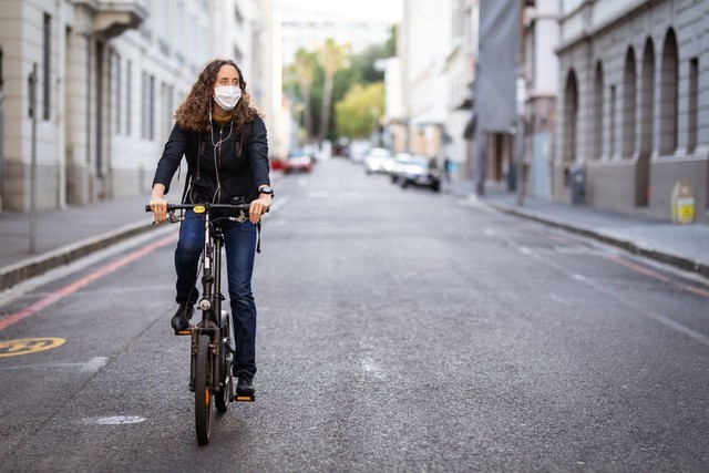 白人妇女戴着防护面具和耳机,在街上骑自行车