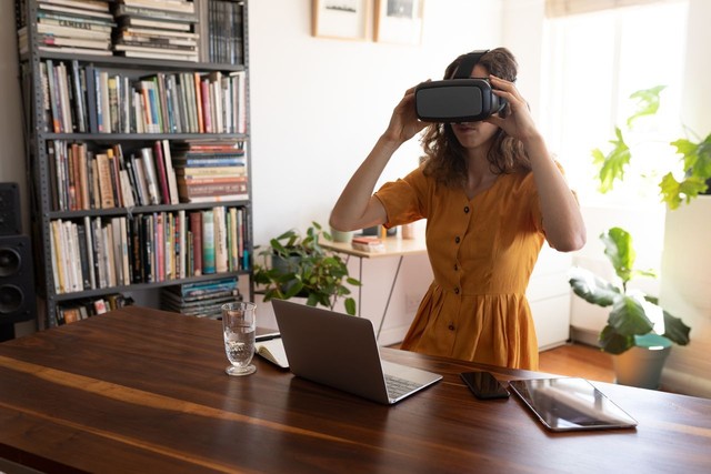使用虚拟现实耳机在冠状病毒新冠大流行期间在家自我隔离的高加索妇女