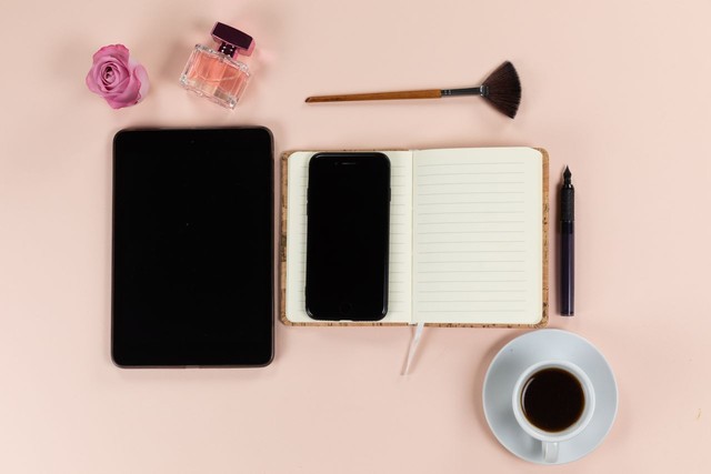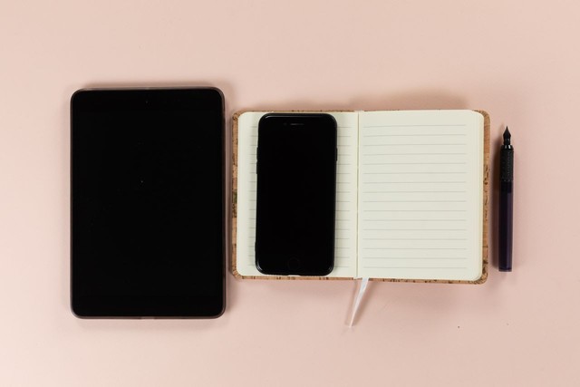 粉色背景上带有笔记本和笔的平板电脑和手机视图