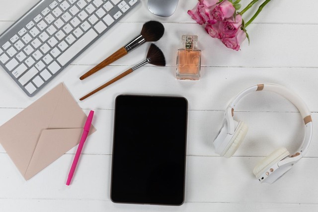 白色木质背景上化妆、平板电脑、鲜花和耳机的关键字视图