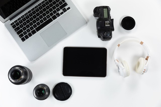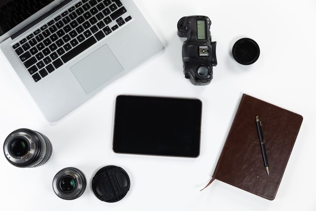 笔记本电脑和平板电脑的视图,带有白色背景中的相机和长矛