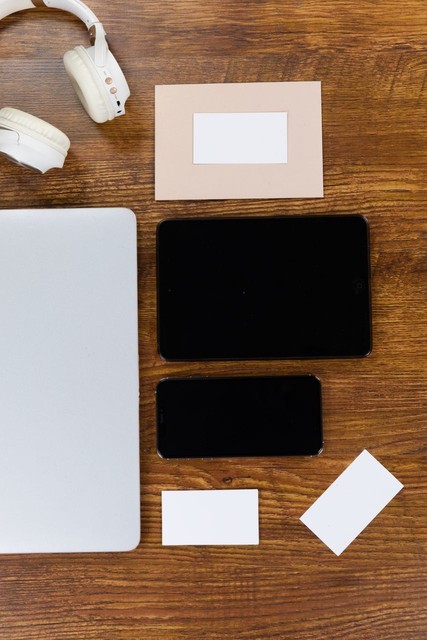 带平板电脑和智能手机的笔记本电脑视图,木桌背景上的enveoppe和耳机