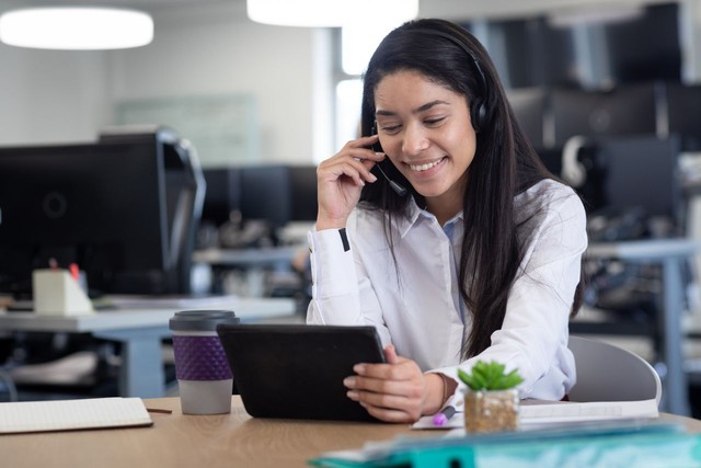 女商人在现代办公室戴着耳机使用数字平板电脑
