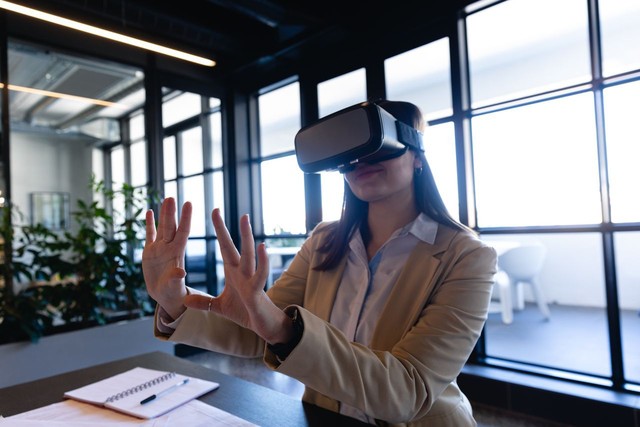 高加索女性在办公室使用虚拟现实