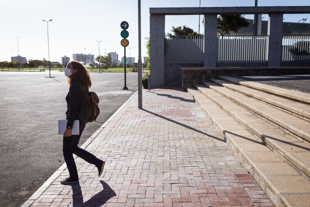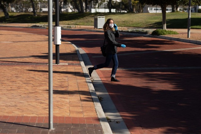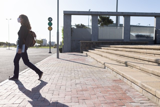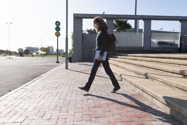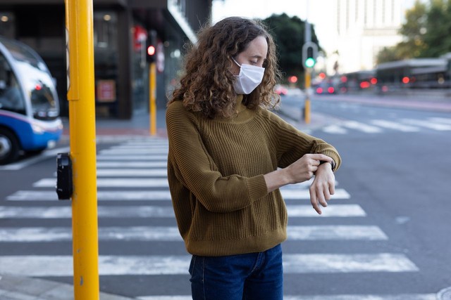 白人妇女戴着防护面具走在街上