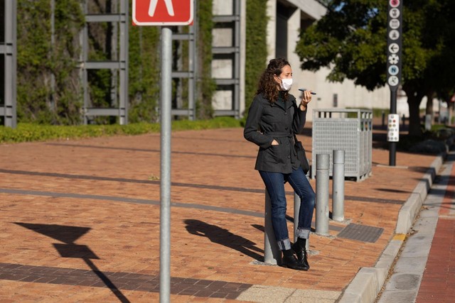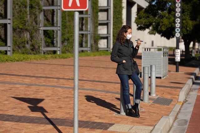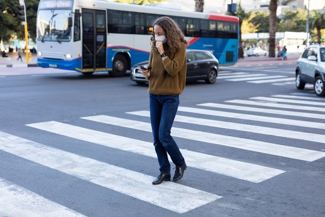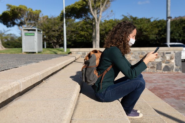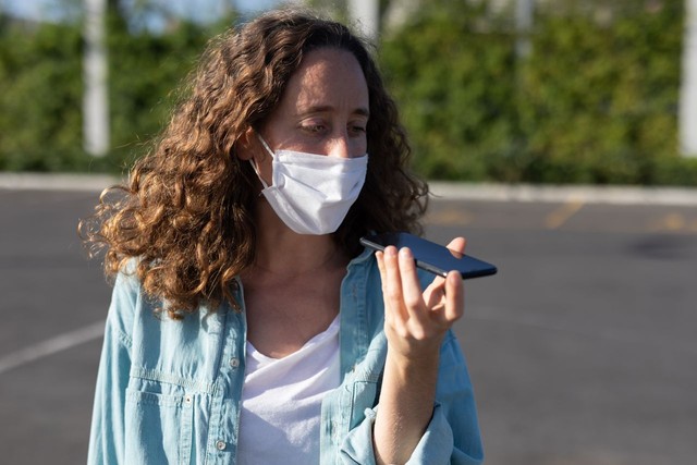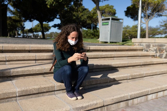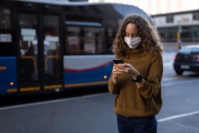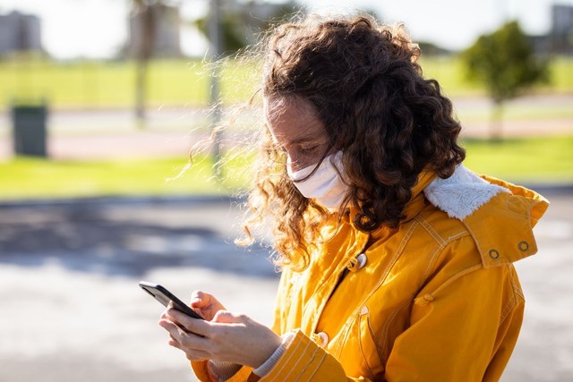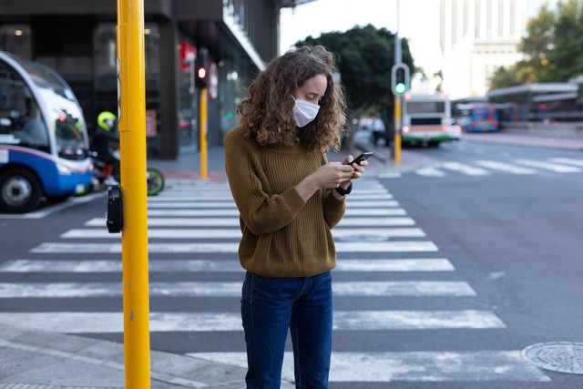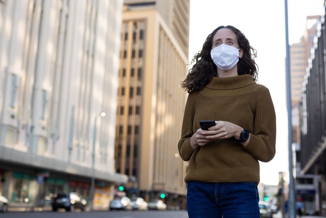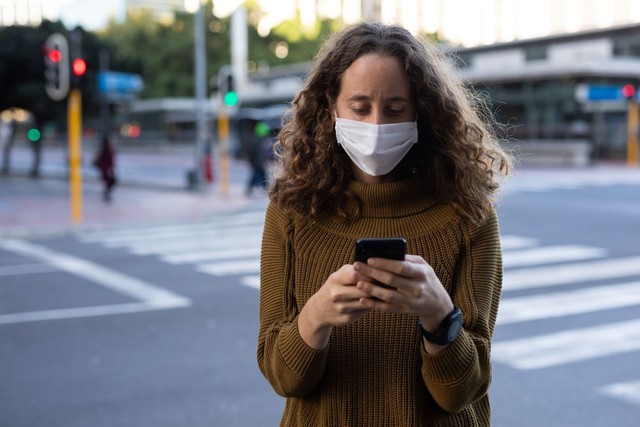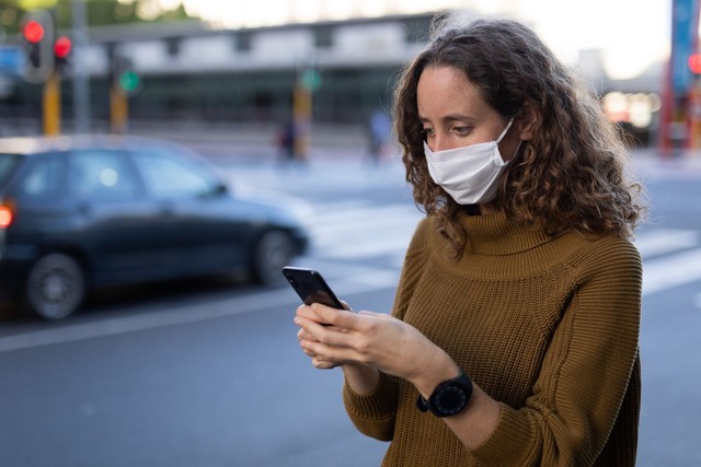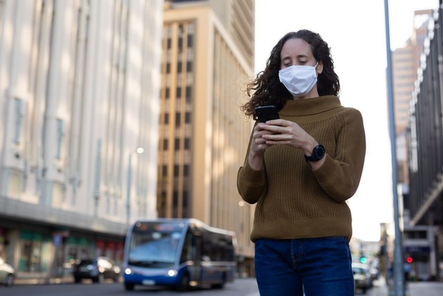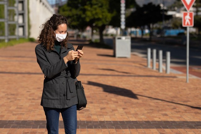白人妇女在街上戴着防护面具,用手机