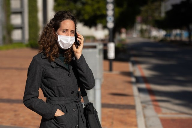 白人妇女戴着防护面具在街上打电话