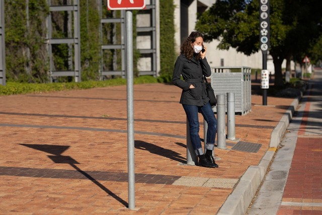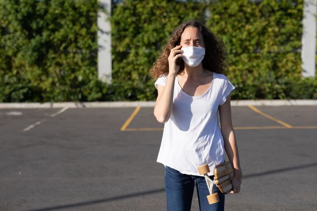 戴着防护面具的白人妇女在街上坐着打电话