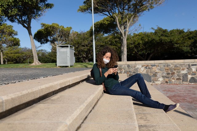 白人妇女戴着防护面具在街上用手机