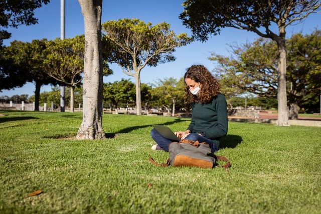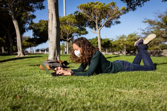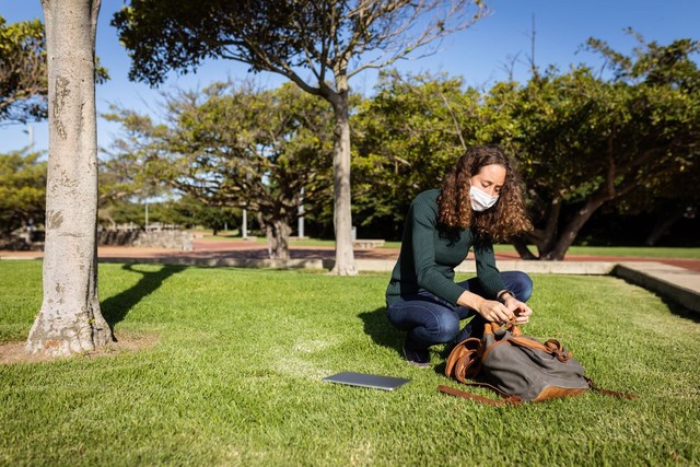 一名白人妇女戴着防护面具在花园里使用笔记本电脑