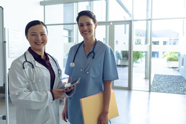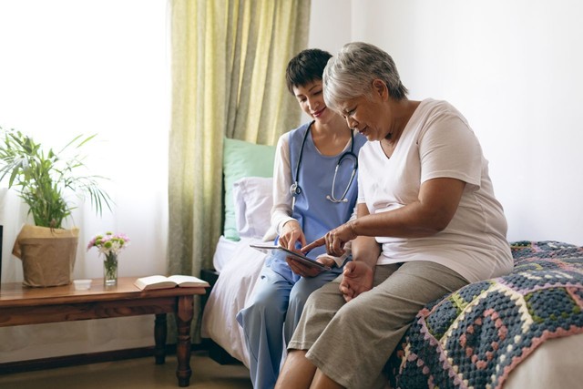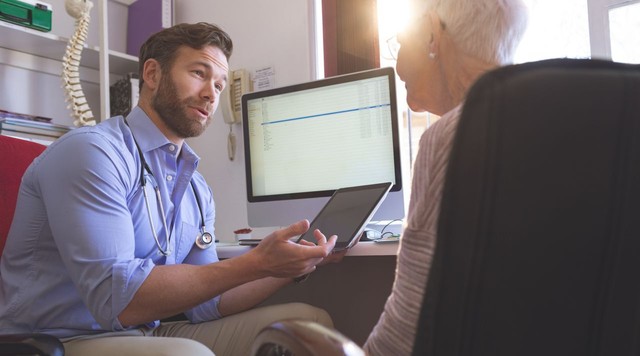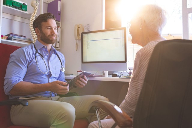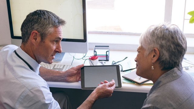 男医生在诊所与资深女性交谈时使用数字平板电脑