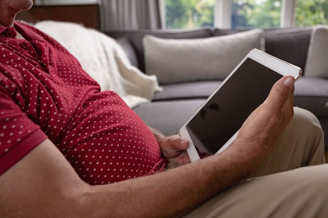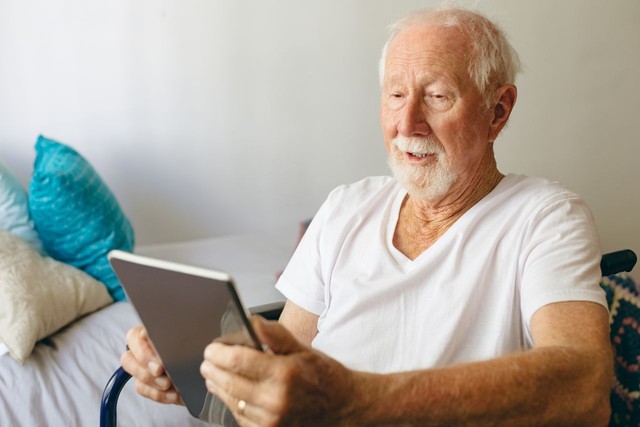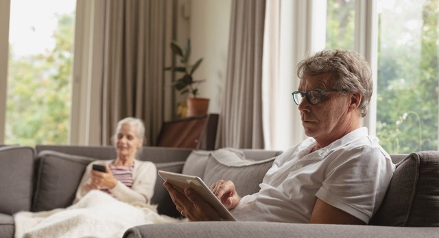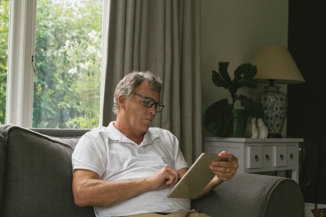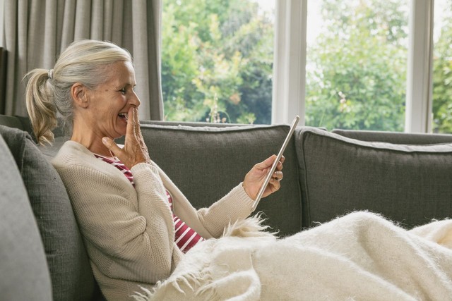 在舒适的家中,在沙发上使用数字平板电脑的活跃老人